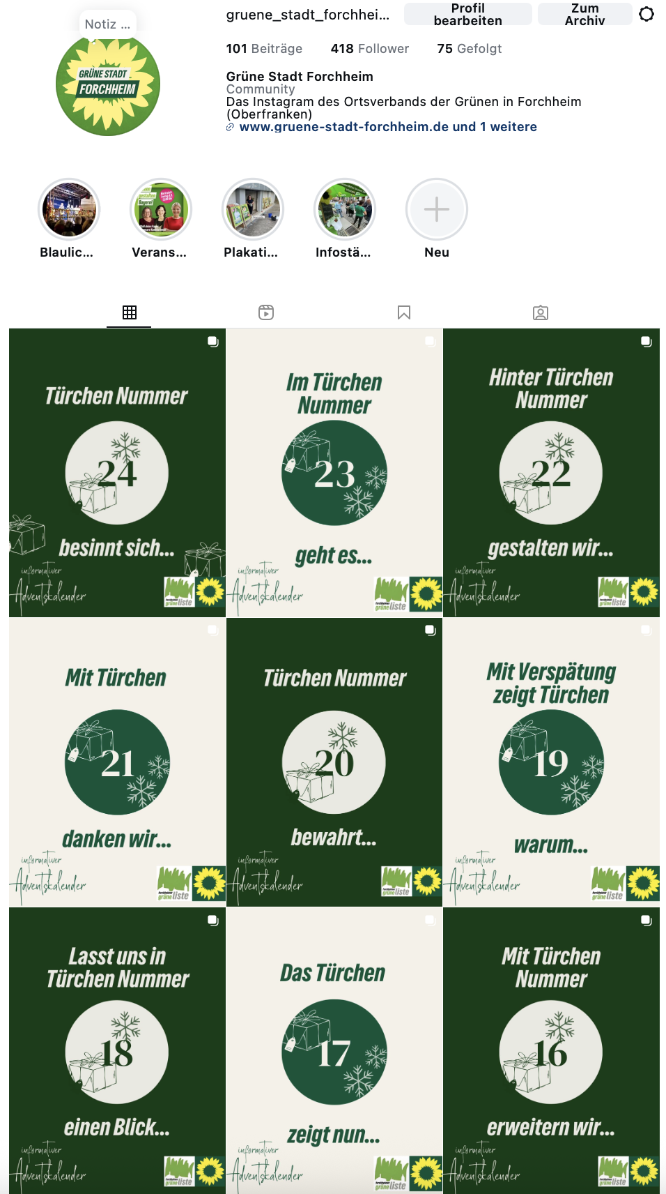 Alle Türchen unseres Adventskalenders könnt ihr weiterhin auf unserem Instagram-Kanal der Forchheimer Grünen (@gruene_stadt_forchheim) nachlesen. Dort findet ihr die Beiträge gesammelt – vom ersten Türchen mit einem Blick auf unsere Webseite bis hin zu den Themen für die Zukunft unserer Stadt.
