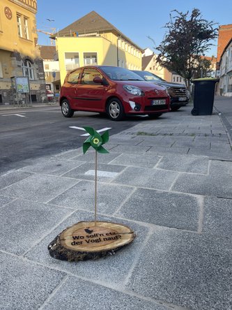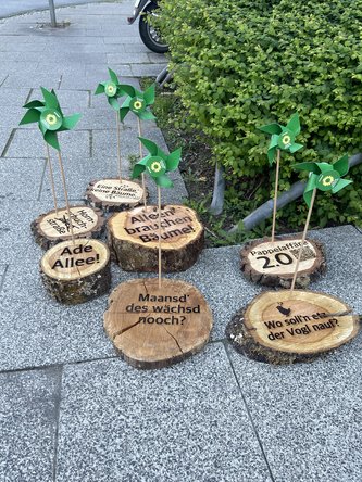 Mit einer Kunst- und Protestaktion möchten die Forchheimer Grünen am Tag der Arbeit auf die schwindende Begrünung in der Hornschuchallee aufmerksam machen. An markanten Stellen verteilten sie Baumstümpfe mit prägnanten Sprüchen – diese sollen daran erinnern wie wichtig Bäume für das Stadtklima und die Aufenthaltsqualität in der Innenstadt sind.